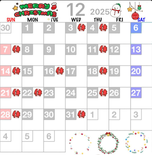 12月の営業日は下記になりますのでご確認よろしくお願い致します🙇‍♀️